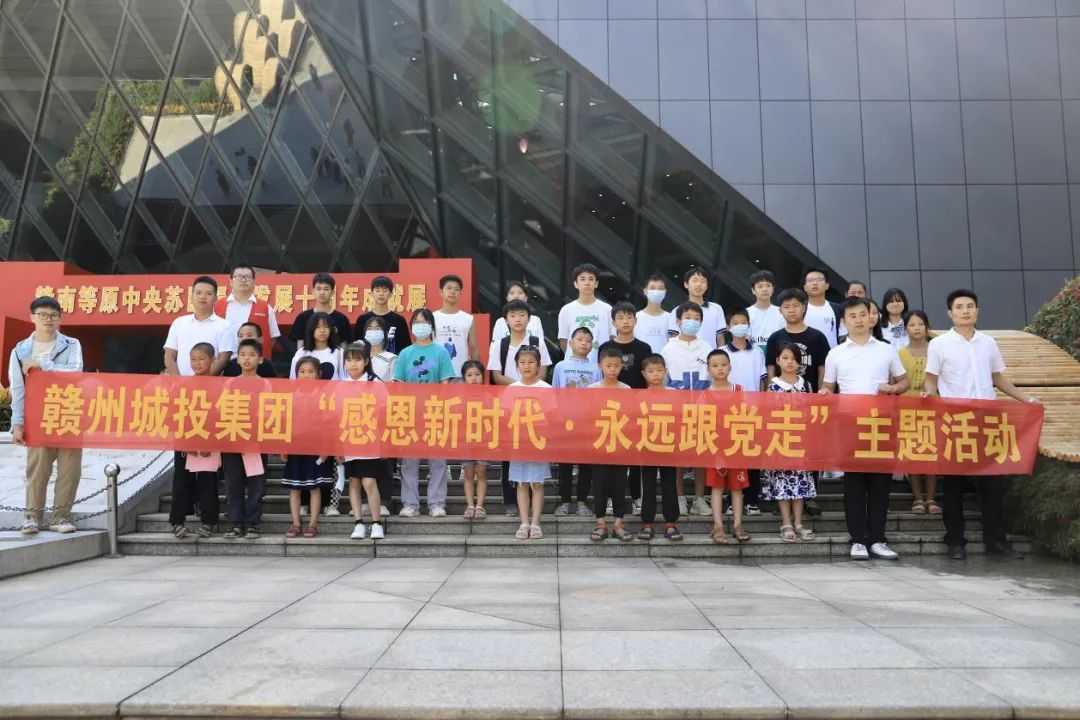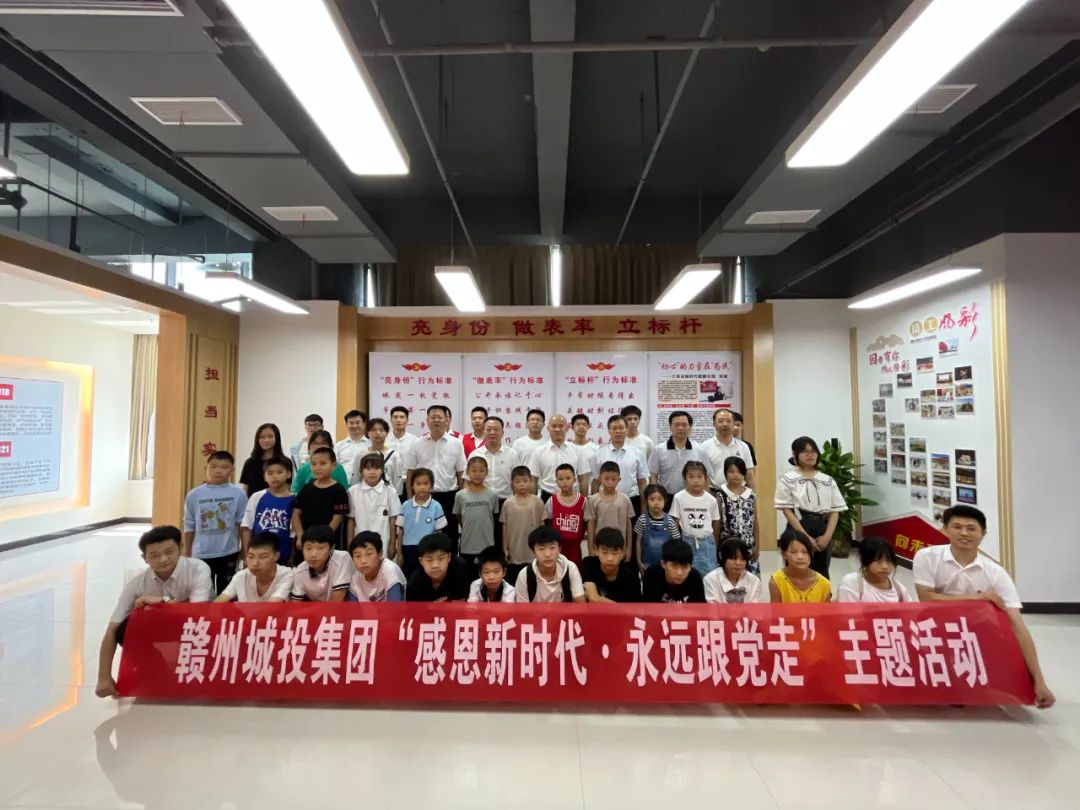 紅色七月,炎炎夏日,崇義縣一群可愛的小朋友來到贛州,留下了一次別樣暑假體驗(yàn)的美好回憶。7月13日,贛州城投集團(tuán)黨委開展助學(xué)筑夢教育幫扶主題活動,集團(tuán)領(lǐng)導(dǎo)結(jié)對幫扶的崇義縣龍勾鄉(xiāng)東山村、良田村部分學(xué)生及其他學(xué)生代表共32人應(yīng)邀參加。這次活動的主題為“感恩新時代·永遠(yuǎn)跟黨走”,分別參觀了贛州市自然博物館、贛州科技館和集團(tuán)黨性教育體驗(yàn)室,開展了紅色誦讀、講紅色故事、唱紅色歌曲、看紅色影片等活動。期間,集團(tuán)黨委書記、董事長劉曉方,黨委副書記、總經(jīng)理郭閩軍及其他在家高管與孩子們親切交流,并一起合影留念。