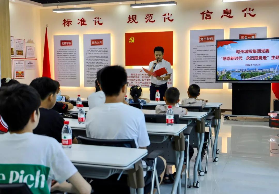 在集團(tuán)黨性教育體驗(yàn)室,由集團(tuán)機(jī)關(guān)一支部的黨員代表為孩子們精心準(zhǔn)備了紅色傳承系列活動,黨員們深情朗誦了方志敏的《可愛的中國》,講述了紅色故事《八子參軍》,合唱了《沒有共產(chǎn)黨就沒有新中國》,并陪伴孩子們一起觀看了紅色影片《建黨偉業(yè)》,進(jìn)一步增進(jìn)孩子們對黨的歷史的了解,深切體會當(dāng)今美好生活的來之不易。臨別時,贛州城投集團(tuán)團(tuán)委也給孩子們分別贈送了小禮物。