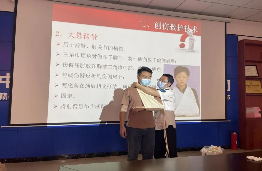 在應(yīng)急救護知識培訓(xùn)階段,贛州市急救中心醫(yī)務(wù)人員對應(yīng)急救護知識進行現(xiàn)場授課,重點對止血包扎、海姆立克急救法進行實操演練,大家現(xiàn)場學(xué)習(xí)了如何利用生活中隨處可見的物品對較小創(chuàng)傷進行自救的方法。