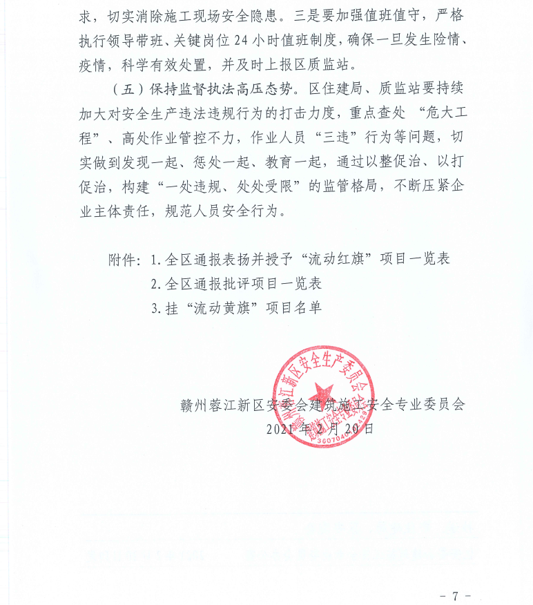 3月2日上午,贛州蓉江新區(qū)表彰通報2021年贛州蓉江新區(qū)建筑施工安全“流動紅旗”競賽暨安全生產(chǎn)大比武活動開展情況,其中,星洲萃苑(一期)項目在此次評比中喜獲“流動紅旗”,并獲得贛州蓉江新區(qū)安委會發(fā)放的經(jīng)濟獎勵12000元整。