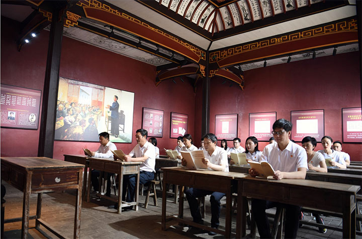 在興國(guó)縣蘇維埃政府所在地——瀲江書院,毛主席在這里舉辦了興國(guó)縣土地革命干部訓(xùn)練班,為中央蘇區(qū)的土地革命培養(yǎng)了第一批斗爭(zhēng)骨干,建立了興國(guó)縣第一個(gè)革命政權(quán)。大家在土地革命干部訓(xùn)練班舊址學(xué)堂內(nèi),集體誦讀了一段土地革命時(shí)期的歷史,當(dāng)朗朗書聲再次在書院響起,珍貴的革命記憶浮于腦海,激勵(lì)黨員們延續(xù)紅色根脈、傳承紅色基因。