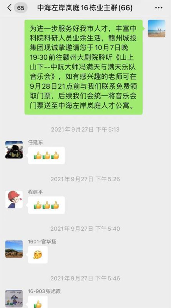 9月17日,支部書記帶隊再次到人才公寓走訪,了解到科研人員平時忙碌、業(yè)余文化生活不豐富,大部分科研人員中秋國慶期間因離家較遠和疫情防控將留贛。為滿足人才精神文化需求,民晟實業(yè)公司聯(lián)合贛州市保利劇院管理有限公司,在“文化惠民”政策下,邀請留贛科研人員在贛州大劇院免費聆聽“山上山下”中阮演奏音樂會,黨員先鋒隊成員還專程送公益票上門。消息一經(jīng)人才公寓業(yè)主群發(fā)出,反響熱烈,獲得科研人員頻頻“點贊”?!案兄x你們的關心關懷和貼心服務,讓我們國慶留贛能聽一場名家現(xiàn)場音樂會!”領票現(xiàn)場,一位科研人員說道。