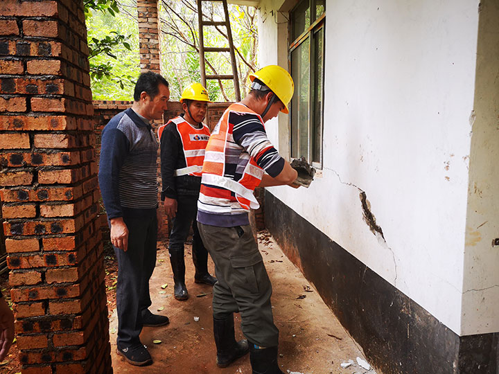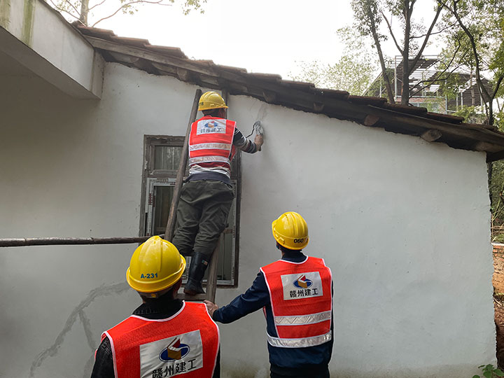 收到群眾訴求后,贛州建工集團(tuán)黨支部明確責(zé)任分工,由贛州建工集團(tuán)駐蓉江花園(四區(qū))項(xiàng)目部的工作人員前往實(shí)地了解情況。該村村民邱家飛年近七旬,所居住的房屋因年久失修,導(dǎo)致門廳墻面破損,房屋內(nèi)外均存在一定程度的裂縫。此外,村里另有一對(duì)姐弟居住的房屋由于結(jié)構(gòu)問(wèn)題也存在幾處裂縫。