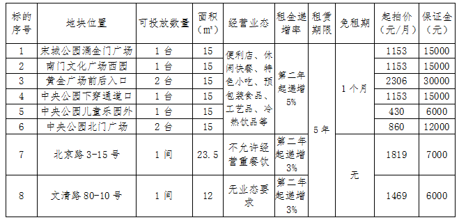 以上清單內(nèi)容僅供參考,以現(xiàn)狀交付,拍賣公司和委托人不承擔(dān)瑕疵擔(dān)保責(zé)任,其中標(biāo)的1-標(biāo)的6僅提供場地,競得人負(fù)責(zé)花車經(jīng)營設(shè)備投資、日常經(jīng)營(包括經(jīng)營秩序、場地保潔、垃圾清運(yùn)、污水廢水處理)。
