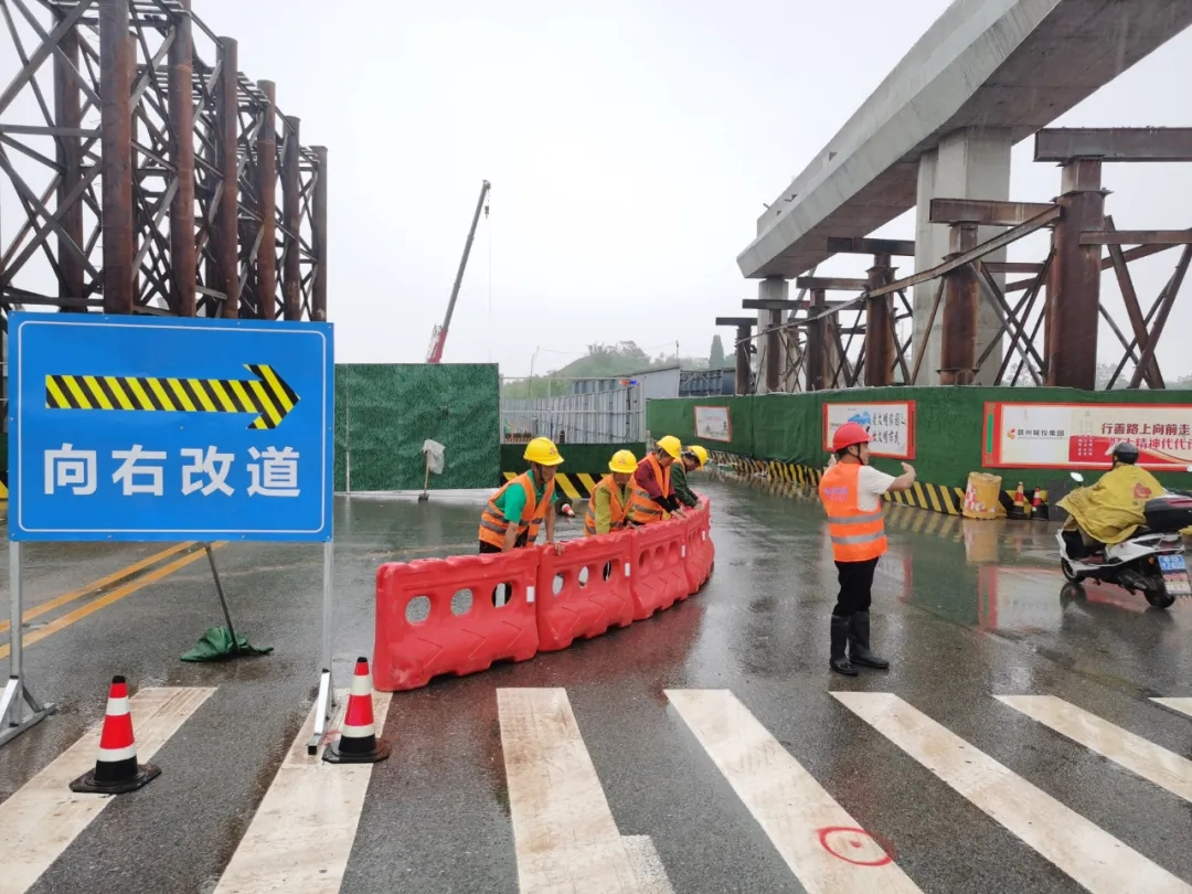 交通安全維護(hù)是項(xiàng)目施工的重中之重。為在確保施工安全和進(jìn)度的前提下,最大限度減少項(xiàng)目建設(shè)對(duì)交通的影響,贛州城投集團(tuán)項(xiàng)目部工作人員迅速行動(dòng),召集施工、監(jiān)理等單位討論編制創(chuàng)業(yè)路橋梁上跨崗邊大道的交通導(dǎo)行方案。為保證交通導(dǎo)行方案的可行性,項(xiàng)目部邀請(qǐng)交警部門、龍泉村村民到現(xiàn)場(chǎng)踏勘,聽取意見、建議,并對(duì)方案進(jìn)一步優(yōu)化、完善。經(jīng)交警部門審批方案通過后,項(xiàng)目部集中力量抓住4月10日和11日周末兩天的空檔期,加班加點(diǎn)完成了跨崗邊大道區(qū)域的交通導(dǎo)行及圍擋,并在后續(xù)施工中安排了專人對(duì)車輛、行人進(jìn)行引導(dǎo),對(duì)隱患及時(shí)排查整改,派駐安全引導(dǎo)員在學(xué)生上下課時(shí)間點(diǎn)到路口對(duì)通行車輛、行人進(jìn)行引導(dǎo),護(hù)航創(chuàng)業(yè)路三標(biāo)上跨崗邊大道橋梁施工階段的原有地面道路社會(huì)車輛及行人有序通行。