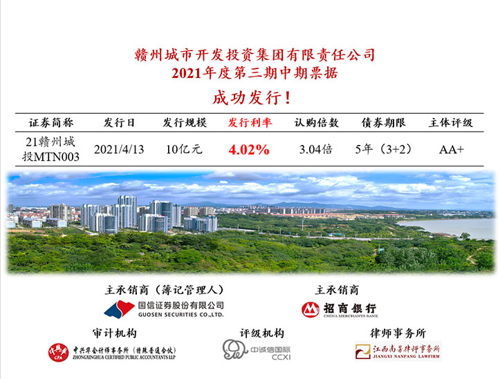 4月13日,贛州城投集團(tuán)2021年度第三期中期票據(jù)成功發(fā)行,金額10億元,發(fā)行利率4.02%/年,創(chuàng)集團(tuán)中長(zhǎng)期債券品種利率新低,亦創(chuàng)近兩年全省同資質(zhì)同期限10億元以上公司債、企業(yè)債和協(xié)會(huì)產(chǎn)品的價(jià)格新低。同時(shí)該債券是贛州城投集團(tuán)戰(zhàn)略發(fā)展部黨支部全體黨員黨史學(xué)習(xí)教育成果與業(yè)務(wù)成果的有力轉(zhuǎn)化。